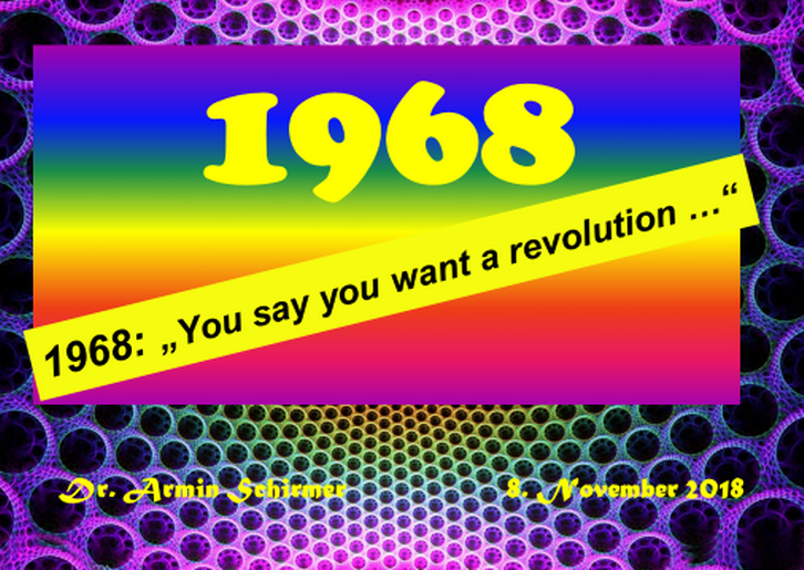 Vortrag von Dr. Armin Schirmer, 8. November 2018 1968: das war damals ein Aufbruch mit Utopien, in denen Freiheitsvorstellungen eine Rolle spielten, eine kulturelle Revolution mit starken emanzipativen Elementen. War 1967 noch das Jahr der Liebe und der Blumen gewesen, entpuppte sich 1968 als das der blutigen Kämpfe, der Gewalt und der Ernüchterung. Die Protestbewegungen kamen aus allen Richtungen: Anti-Atom-Bewegung, Abrüstungs-Bewegung, Bürgerrechts-Bewegung, Anti-Kolonial-Bewegung, Free Speech Movement, Studenten-Bewegung, Anti-Vietnamkriegs-Bewegung, Civil Rights Movement, Ostermarsch-Bewegung, Außerparlamentarische Opposition, Opposition gegen Springer, Opposition gegen die Notstandsgesetzgebung. Das Jahr 1968 offenbarte den politischen, kulturellen und moralischen Bankrott des Establishments. Und die Popmusik war der perfekte Soundtrack für die neuen Ideen: In-A-Gadda-Da-Vida, A Saucerful Of Secrets, Wheels Of Fire, Electric Ladyland, Ogden’s Nut Gone Flake, Born To Be Wild, Albatross. Und Tom Wolf schrieb “The Electric Kool-Aid Acid Test”. Und Bob Beamon sprang 8.90m weit. |
