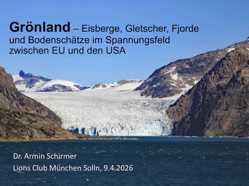 Grönland - Eisberge, Gletscher, Fjorde und Bodenschätze im Spannungsfeld zwischen EU und USA Vortrag im Lions-Club München-Solln Clublokal Zum Sollner Hirschen am 9. April 2026 von Dr. Armin Schirmer Der Vortrag beschäftigt sich mit verschiedenen Aspekten der Insel Grönland, die in den letzten Monaten intensiv die politische Diskussion beherrscht haben: Ø Historie mit Inuit und Wikingern Ø die historische Beziehung zwischen Grönland und Dänemark Ø die Beziehung in der Historie und aktuell zwischen den USA und Grönland und Dänemark Ø die aktuellen Drohungen der USA zum Erwerb von Grönland Ø der Klimawandel in Grönland Ø die Rohstoffsituation in Grönland Ø Ausblick Die verschiedenen Teilaspekte werden ergänzt durch eigene Fotos des Autors von einer umfangreichen Grönlandreise. |